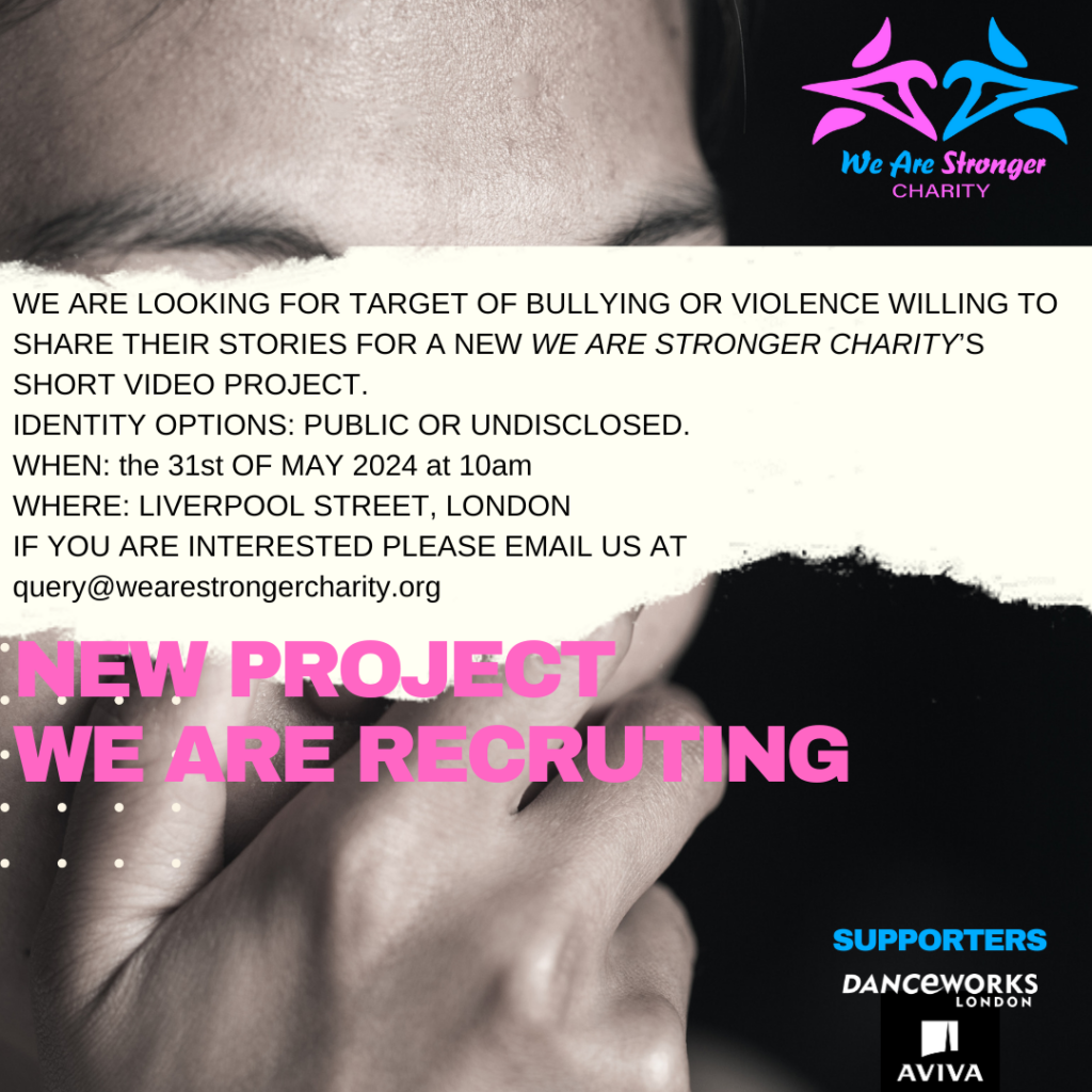 We are looking for targets of bullying or violence willing to share their stories for a new We Are Stronger Charity‘s Short Video Project. Identity Options Public or Undisclosed When 10:00am 31 May 2024 Where Liverpool Street, London If you are interested, please email us at query@wearestrongercharity.org. Olga Venosa, Founder and ChairOlga is a finance […]